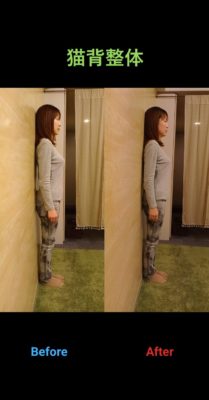 先日、当サロンで猫背整体を受けていただいたお客様の施術前後の写真を共有させていただきます。(掲載許可をいただいております)
